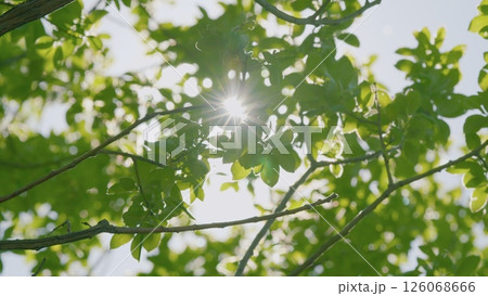 The enchanting beauty of sunlight streaming through the lush green leaves all around
