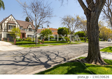 Landscape garden with dense flowering shrubs, orange-red blossoms, neat green hedges, and shaded trees, creating a tranquil and colorful outdoor space for nature walks, relaxation, and public