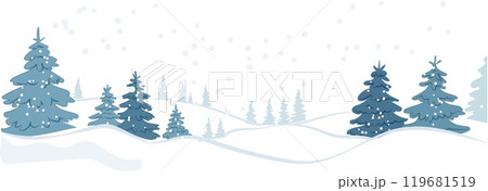 A serene winter landscape featuring snow-covered trees and gentle hills in a cool color palette. Vector illustration