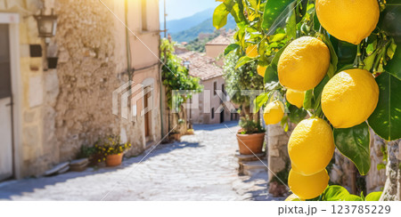 picturesque Mediterranean village street lined with lemon trees and rustic stone houses