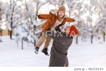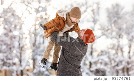 Little son having fun with dad while playing in winter park during New year and Christmas holidays