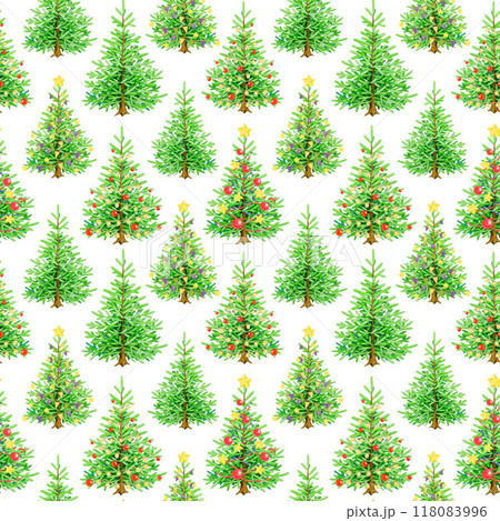 Christmas tree seamless pattern on white background. Hand drawn vintage style evergreen fir trees with festive bright decoration. Winter holidays tree festive traditional decor pattern element