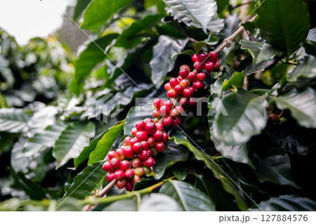 Close up harvest red ripe coffee seed robusta arabica berry harvesting coffee farm. Harvest coffee bean ripe Red berries plant fresh seed coffee tree growth in green eco organic farm green background