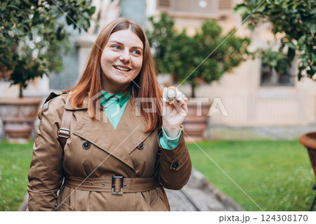 Happy 30s woman holding Sicilian cannolo tube pastry filled with cream outdoors. Travel, Italy, food and holidays concept. Young woman eating traditional delicious cake cannoli, Traveling Europe