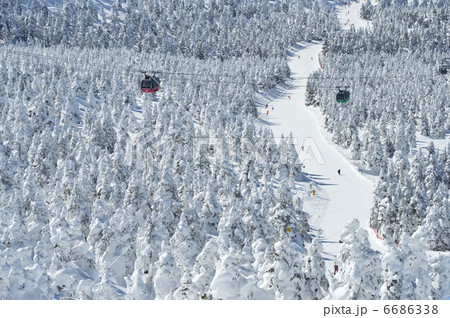 山形蔵王白銀世界樹氷原の樹氷とスキー場ゲレンデ