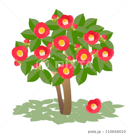 赤い花が咲いているヤブツバキの木と木陰