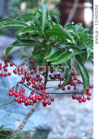 赤い実のなっている、マンリョウの木(縦位置)