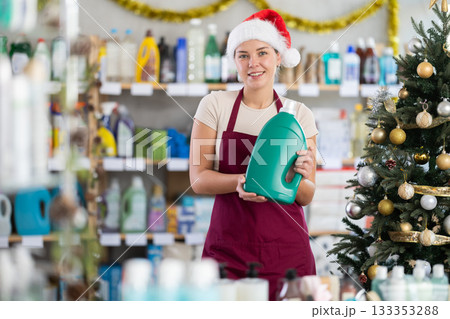 Young saleswoman offering detergent in store with New Year decoration