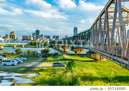 大阪府の淀川にかかる阪急千里線淀川橋梁と長柄水管橋