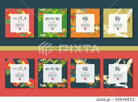 和風デザインフレームセット。椿・橘・松竹梅・鶴。冬の素材。