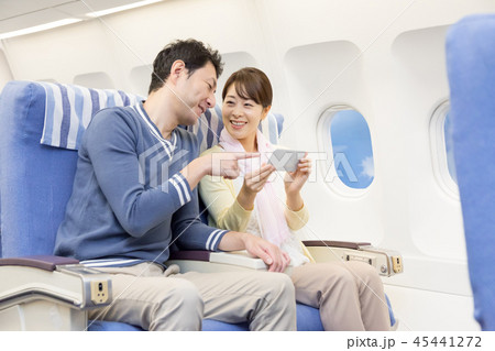 飛行機 機内 旅行 夫婦 スマートフォン