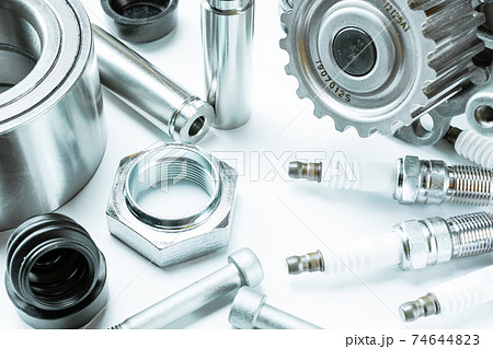 Car motor parts. Auto motor mechanic spare or automotive piece on white background. Set of new metal car part. Repair and vehicle service.