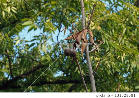 丸くて茶色い実がついた落葉性高木栃の木
