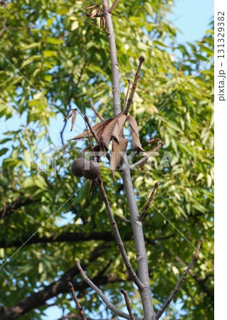 丸くて茶色い実がついた落葉性高木栃の木
