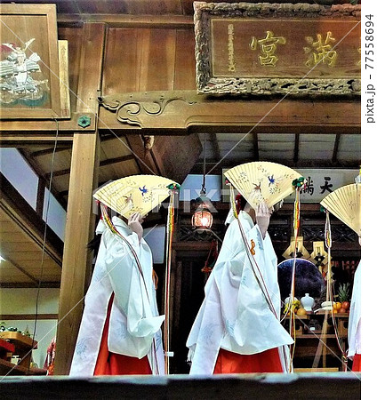 秋祭りの巫女舞、浦安の舞を踊り始める所上半身、扇を高く両手で持ち上げている所