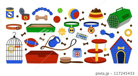 Pet goods. Dog or cat icon food, toy and house, care vet, animal bed and accessory. Kitten and puppy training, canine supplies cage stuff. Veterinary store. Vector zoo tidy object, cartoon flat style