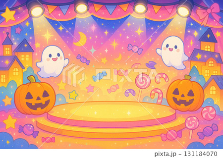 ゆめかわいいハロウィンステージ背景イラスト おばけとキャンディ