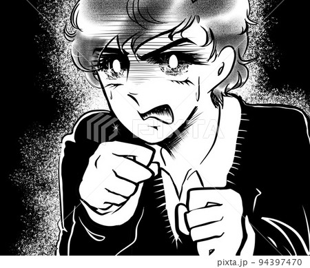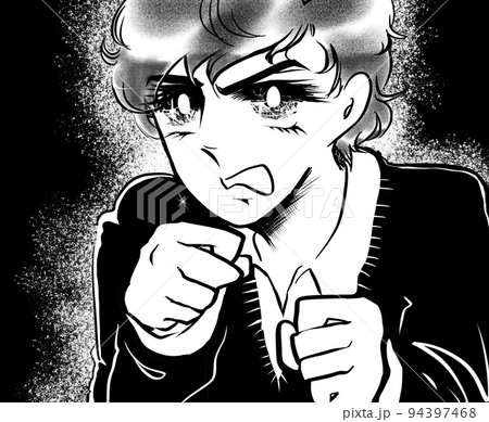 70年代少女漫画黒髪天然パーマの美少年が裏切りに怒り睨みつける白黒イラスト