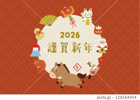 2026年 午年 縁起物の円形フレームイラスト 謹賀新年