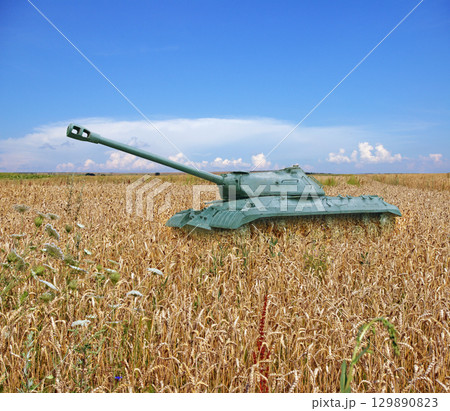 Old tank on field of yellow wheat and blue sky with clouds on the horizon. concept of war in Ukraine