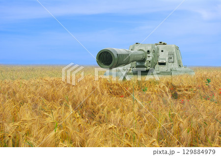 Tank on the field of yellow wheat and blue sky. The concept of war in Ukraine