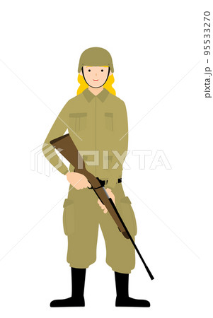 女性兵士のポーズ、ライフル銃を持って見張りに立つ