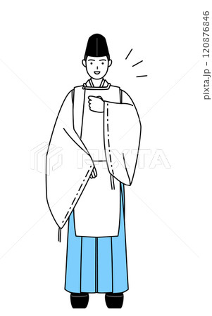 胸を叩く神社の神主、烏帽子と狩衣姿