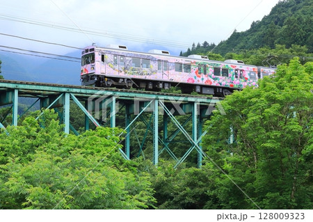 秩父鉄道「山間部の鉄橋を走る美しい花柄の電車」