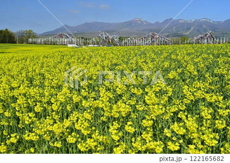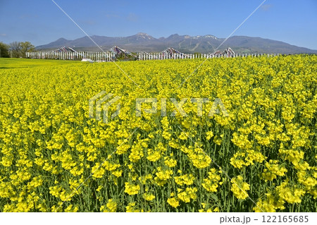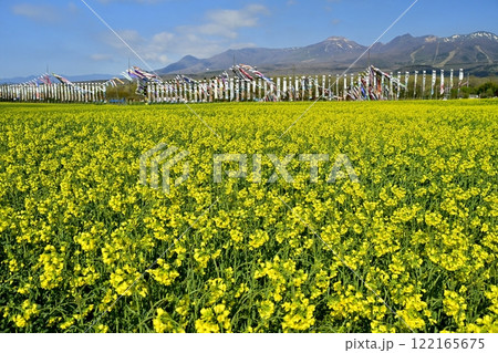 菜の花畑に鯉のぼりと武者幟に那須連山