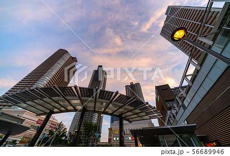 日本の川崎都市景観 武蔵小杉駅前。夕焼けに染まるタワーマンション群などを望む