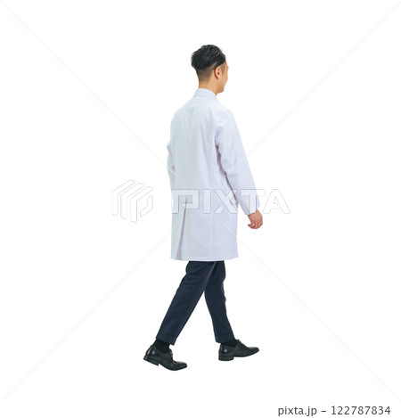 歩く白衣を着たミドル男性医師・科学者・研究者の後ろ姿 手作業で精密に切り抜いた背景透過全身写真PNG