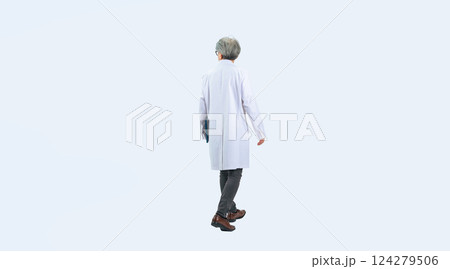 横向きに歩くシニア男性医師・科学者・研究者の全身写真