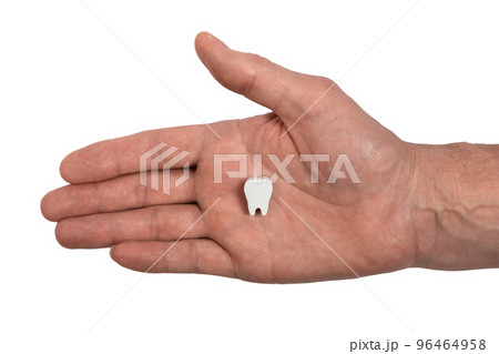 Man hand with tooth isolated on white background. Oral hygiene, dental care concept.