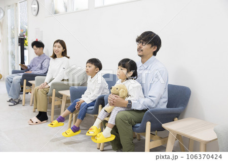 歯医者、クリニックの待合室でテレビを見ながら待つ親子と男性患者