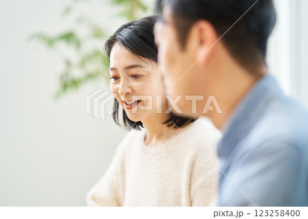 ソファーに座り談笑するミドル夫婦