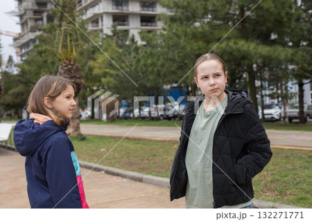 Funny little girls in season jacket talking outdoors, childhood