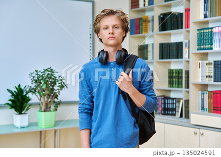 Portrait of serious teenage student with backpack in classroom library