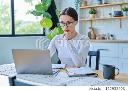 Teenage girl student sitting at the table with laptop, textbooks in home interior