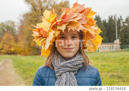 Autumn portrait of a smiling happy girl child in autumn park outdoor