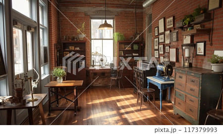 A sunlit vintage home office featuring antique furniture, a typewriter, sewing machine, and lush green plants..