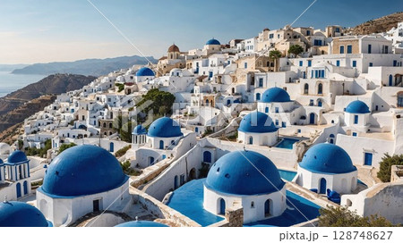 Breathtaking panoramic view of a traditional Greek village cascading down a hillside, featuring iconic white houses with vibrant blue domed roofs against a clear sky