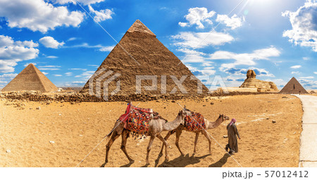 The Pyramids of Giza and camels in the desert of