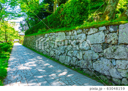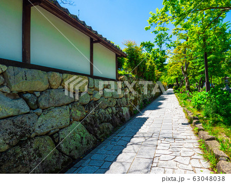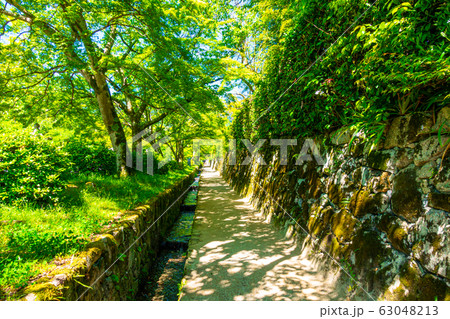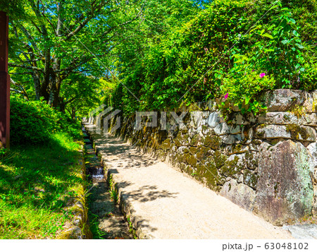 大津市坂本の風景 石畳の道を覆う新緑の木々