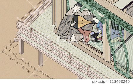 逢瀬する袿姿の女性と直衣の男性の吹抜屋台風のイメージイラスト