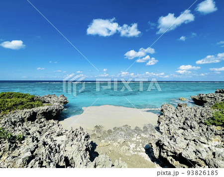 【鹿児島県奄美群島】与論島のエメラルドグリーンの海と雲が映る砂浜
