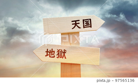 天国と地獄文字入り道しるべと幻想的な空