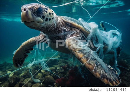 AI-generated content. Sea turtle caught in a plastic bag trap. Photo underwater
