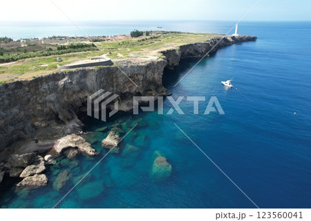 沖縄県中頭郡読谷村宇座 残波岬突端に建つ白亜の残波岬灯台と断崖の下の青い海