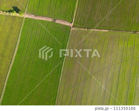 Aerial view of paddy rice field agriculture farm in a tropical rural countryside in the dry season