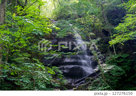 夏の奥入瀬渓流、黒い岩肌を階段状に流れる「九段の滝」